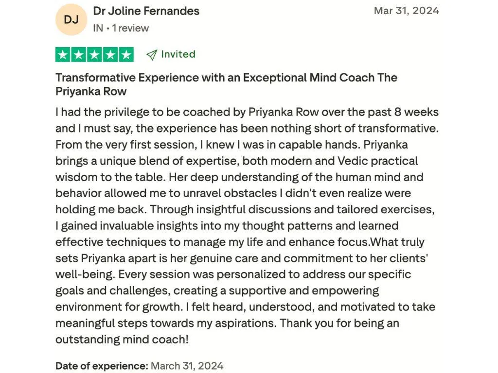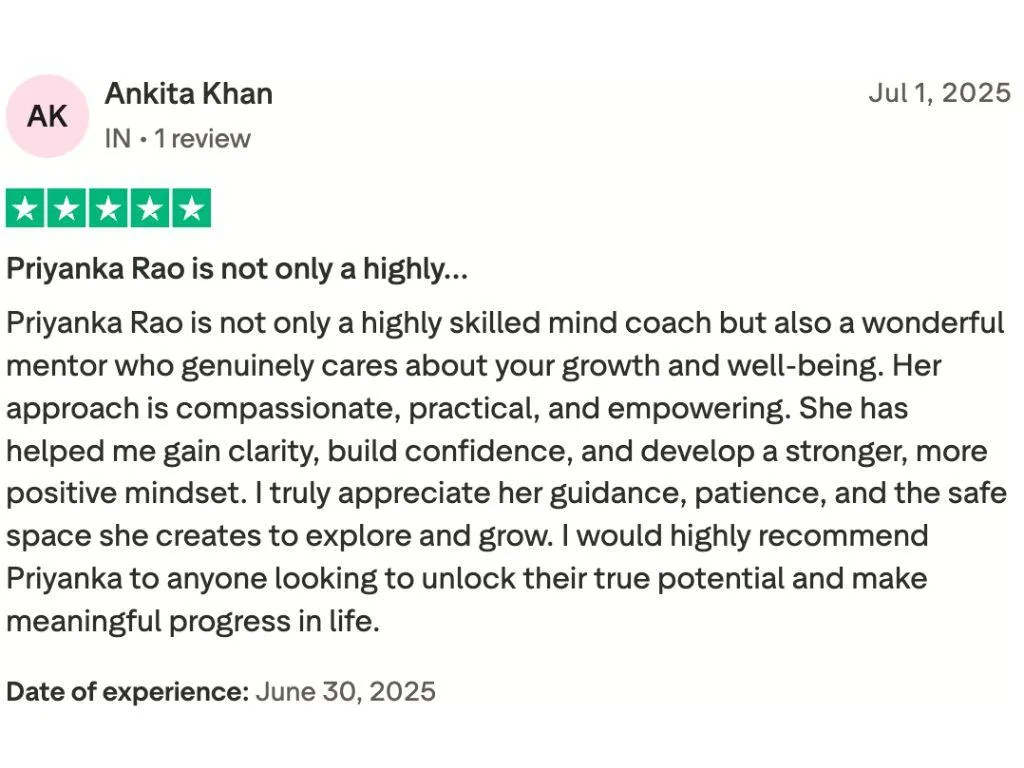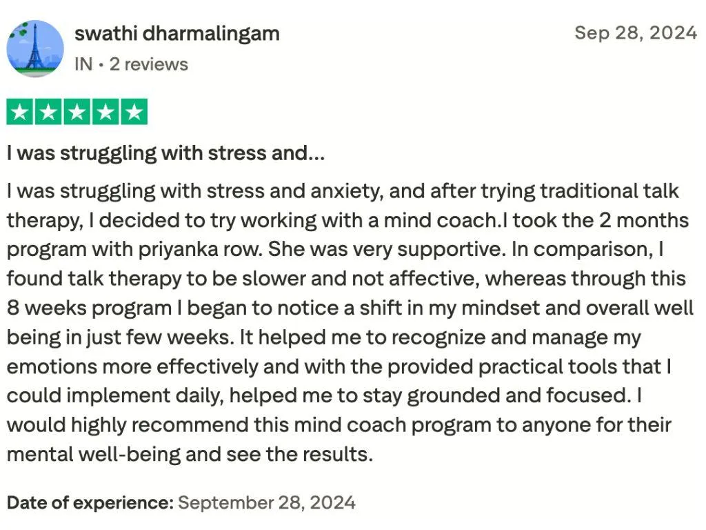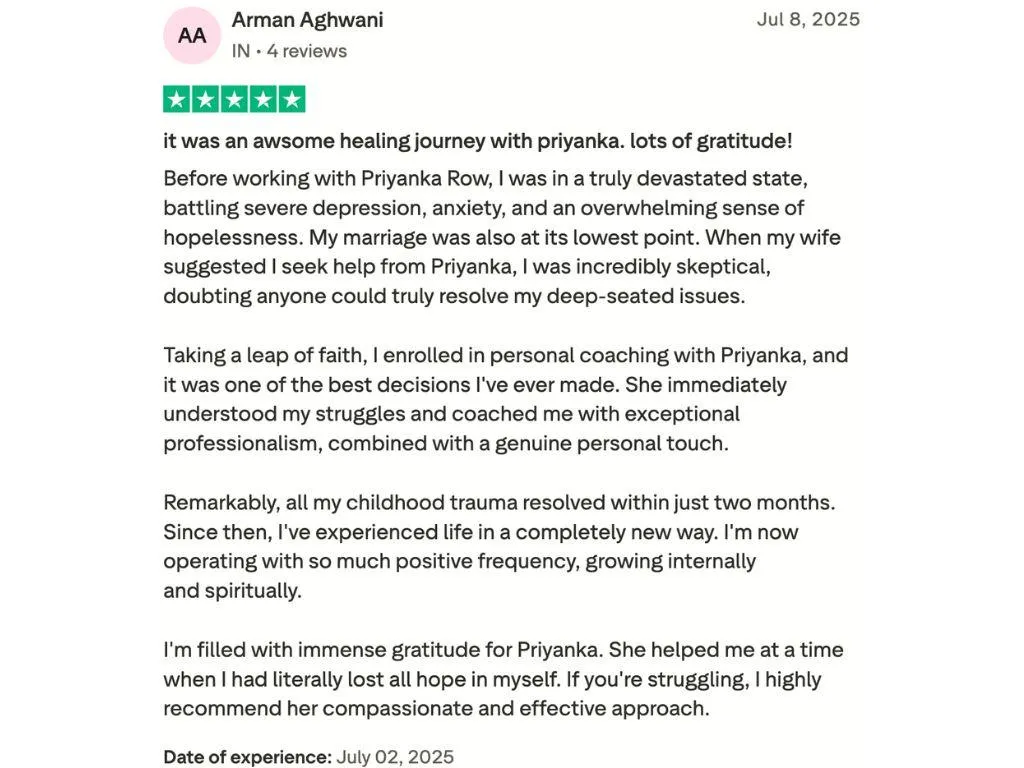 Priyanka Row LLP is a coaching service. We believe, with therapy, trauma-informed care and coaching, individuals can be better prepared to navigate through life by self-regulating their mindset, emotions and beliefs. But we do not guarantee 100% results in our coaching. Results vary, are not typical, and rely on individual effort, time, and skill, as well as unknown conditions and other factors.